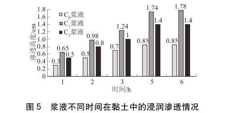 从图5的试验结果可知:3种浆液在开始渗透后的3h内浸润渗透速度相对较快,3~5h之间,浸润渗透速度相对变慢,5h后浸润渗透高度趋于稳定。在相同时间内,浆液在黏土中的浸润渗透高度C1>C2>C0。渗透稳定后,C1、C2浆液在黏土中的浸润渗透高度比C0浆液的浸润渗透高度分别提高了109.4%和64.7%,说明表面活性剂可以提高浆液的渗透性,且表面活性剂S1提高浆液渗透性的幅度更大。