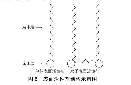从图3中可以看出加入表面活性剂S1、S2能降低浆液的表面张力和接触角。这是因为本次浆液改性选用的表面活性剂S1、S2从化学结构上属于双子型非离子表面活性剂。传统表面活性剂和双子型表面活性剂结构示意图如图6所示。