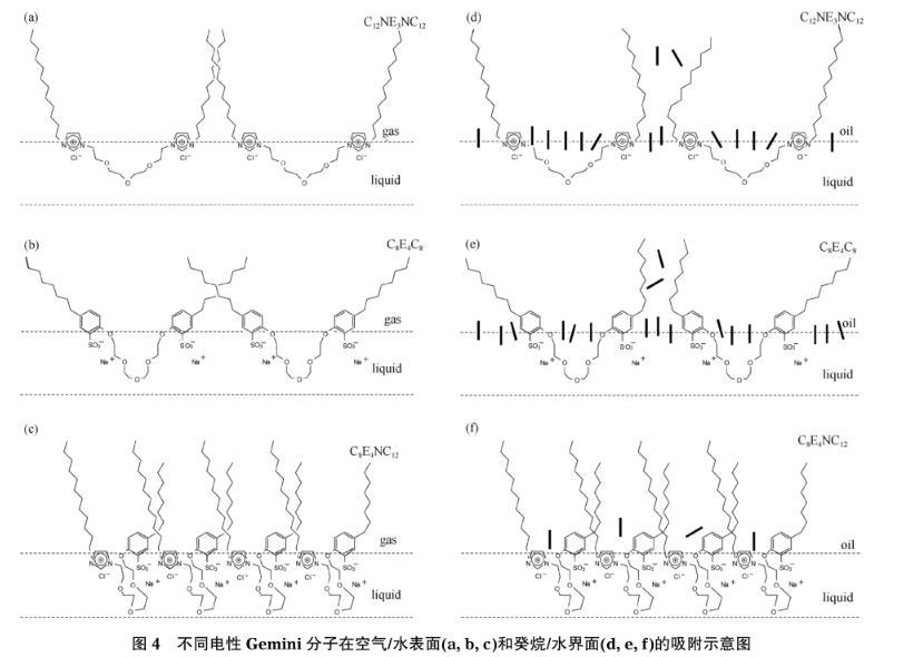 图4不同电性Gemini分子在空气/水表面(a,b,c)和癸烷/水界面(d,e,f)的吸附示意图
