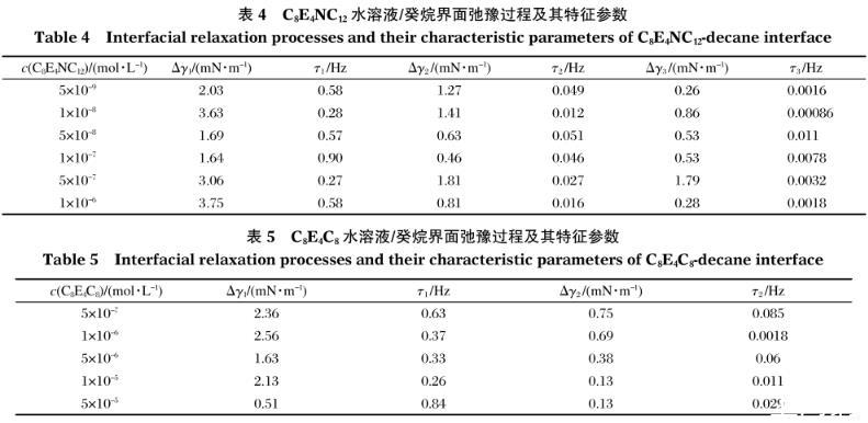 C8E4NC12和C8E4C8分子的界面弛豫过程的特征参数见表4和表5.对比表2和表4可以看出,C8E4NC12分子的表、界面均存在三种类型的弛豫过程,而且其特征弛豫时间十分接近,这证明了C8E4NC12分子在表面和界面的排列特征及分子间相互作用变化不大,与前文中的讨论是一致的。