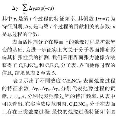 对比表3和表5则可以看出,C8E4C8分子的界面上仍然存在两种类型的弛豫过程,不过其特征时间均明显快于表面;更重要的是,随体相浓度增加,C8E4C8分子在表面上以代表分子取向变化的慢过程为主,而在界面上则以代表扩散交换的快过程为主,这充分说明油分子改变疏水烷基取向、削弱分子间相互作用的机理是可靠的。