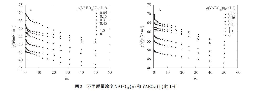 先测定不同质量浓度表面活性剂室温25℃时的静态表面张力,通过γ-lgρ曲线求得VAEO{}_{10}和VAEO20的临界胶束浓度(cmc)分别为0.6和0.7g/L(0.83和0.62mmol/L),临界表面张力(gamma_{text{cmc}})分别为32.9和39.8mN/m.动态表面张力(DST)试验的表面活性剂质量浓度选择在10-1——102cmc之间。不同质量浓度VAEO{}_{10}和VAEO{}_{20}在25℃下的DST测定结果如图2所示。