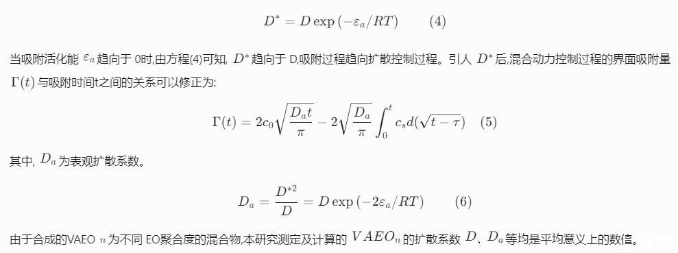 扩散控制的吸附过程,表面活性剂分子由浓度差驱使进入新表面,不存在吸附势垒。Word-Tordai方程描述了界面吸附量Г(t)与吸附时间t的关系:Г(t)=2c0Dtπ-2Dπ∫t0csd(t-τ)(1)式中,c0是溶液本体表面活性剂浓度,mol/L,D是单分子扩散系数,m2/s,cs是次表面表面活性剂浓度,mol/L,τ是整合虚设变量。方程(1)不能直接求解,可通过极限法求解。在t→0时,表面张力γ(t)近似于溶剂表面张力γ0,表面吸附接近平衡时,γ(t)近似于静态表面张力γeq.Fainerman等用渐近的方法对方程(1)进行转化:γ(t→0)=γ0-2nRTc0Dtπ(2)γ(t→∞)=γeq+nRTГ2eqcπ4Dt(3)方程(3)中,t→∞时,c=c0,Γeq表示静态表面张力达到平衡时的表面吸附量。混合动力扩散吸附是指表面活性剂分子从本体扩散到次表面仍然遵循扩散机理,但从次表面层扩散到表面层时需克服一定的势垒。Liggieri和Ravera[15,16]提出,次表面层中的分子,只有能量大于吸附活化能εa才能被吸附到表面,已吸附的分子,只有能量大于解吸活化能εb才能被解吸。以Word-Tordai方程为基础,引入矫正扩散系数D∗。矫正扩散系数D∗和扩散系数D关系定义为:D∗=Dexp(——εa/RT)(4)当吸附活化能εa趋向于0时,由方程(4)可知,D∗趋向于D,吸附过程趋向扩散控制过程。引入D∗后,混合动力控制过程的界面吸附量Г(t)与吸附时间t之间的关系可以修正为:Г(t)=2c0Datπ-2Daπ∫t0csd(t-τ)(5)其中,Da为表观扩散系数。Da=D∗2D=Dexp(——2εa/RT)(6)由于合成的VAEOn为不同EO聚合度的混合物,本研究测定及计算的VAEOn的扩散系数D、Da等均是平均意义上的数值。