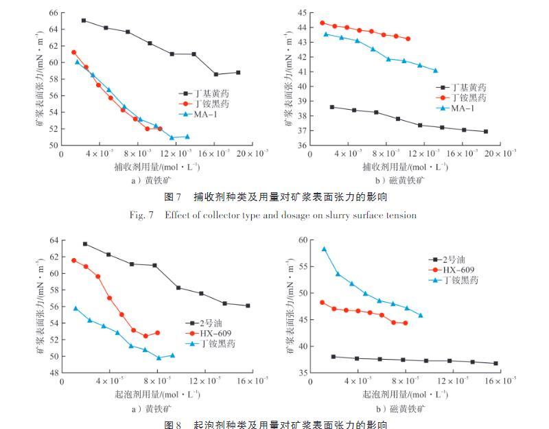 为研究捕收剂种类及用量对矿浆表面张力的影响,将黄铁矿与磁黄铁矿配成30%浓度的矿浆,起泡剂2号油用量3×10-5 mol/L、粒度-0.074 mm占比80%、pH=7,改变捕收剂种类及用量以测定矿浆表面张力,结果见如图7。