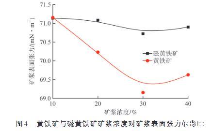 图4黄铁矿与磁黄铁矿矿浆浓度对矿浆表面张力的影响
