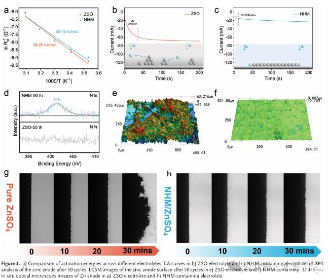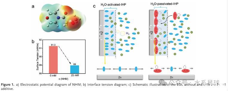 本研究探索了一种新型有机NHM添加剂,旨在增强阳极界面稳定性并改善镀覆/剥离行为。通过降低界面张力,NHM添加剂重塑了电双层(EDL),有效限制了锌阳极与H₂O之间的接触,从而抑制了寄生反应。