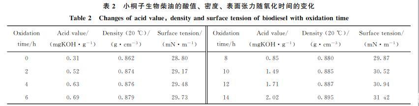 不同氧化时间小桐子油生物柴油的酸值、表面张力与密度的测定结果如表2所示。从表2可得,氧化14h的小桐子生物柴油的酸值由未被氧化时的0.31 mgKOH/g增加到2.02 mgKOH/g,增加了551%,超过ASTM D6751(2001)中规定生物柴油酸值的最大值(0.5 mgKOH/g)。这是由于小桐子生物柴油在氧化后期形成了一些醛类,如己醛和壬醛(见表1),这些醛类经过复杂的二次氧化反应转化为酸类物质,从而导致酸值增加;同时,生物柴油会吸收水分,导致酯的水解,也可使酸值增加。