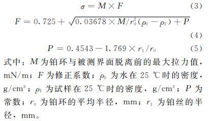 式中:M为铂环与被测界面脱离前的最大拉力值,mN/m;F为修正系数;rho_0为水在25℃时的密度,g/cm³;rho_1为试样在25℃时的密度,g/cm³;P为常数;r_0为铂环的平均半径,mm;r_1为铂丝的半径,mm。