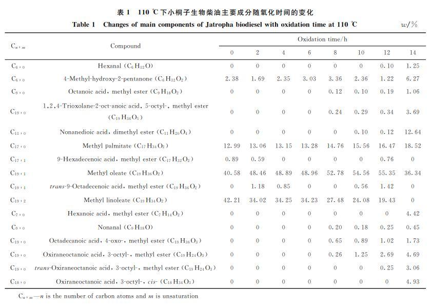 小桐子生物柴油氧化期间GC-MS组成分析结果见表1。由表1可知,小桐子生物柴油的主要成分是棕榈酸甲酯、油酸甲酯、亚油酸甲酯,归一化后的质量分数为95.78%。在氧化过程中,含有2个碳碳双键的亚油酸甲酯的含量降低,氧化0h的小桐子生物柴油亚油酸甲酯(C19:2)质量分数为42.21%,加速氧化14h,质量分数为0,说明亚油酸甲酯几乎完全氧化,这是因为多不饱和脂肪酸甲酯比单不饱和脂肪酸甲酯更容易氧化。与单不饱和脂肪酸相比,亚油酸甲酯的碳链含有更多的双烯丙基位点,双烯丙基质子对氧自由基的攻击敏感,导致分子发生氧化,从而形成过氧化合物,过氧化合物进一步氧化转化成醛、酮等化合物。