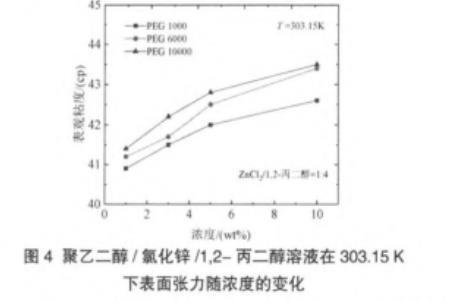 图4聚乙二醇/氯化锌/1,2-丙二醇溶液在303.15 K下表面张力随浓度的变化