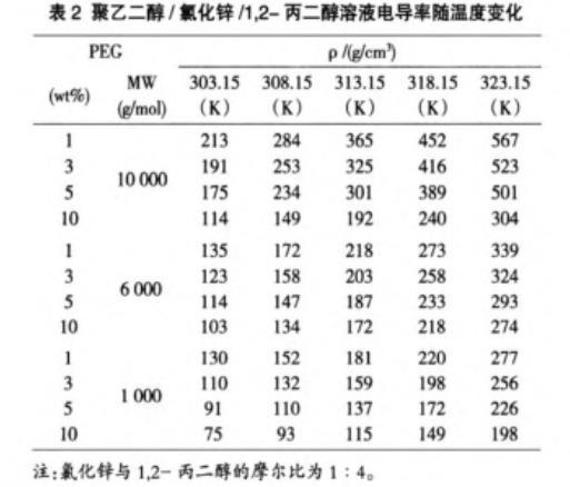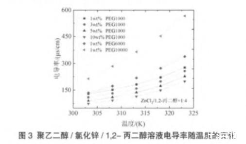 表2聚乙二醇/氯化锌/1,2-丙二醇溶液电导率随温度变化