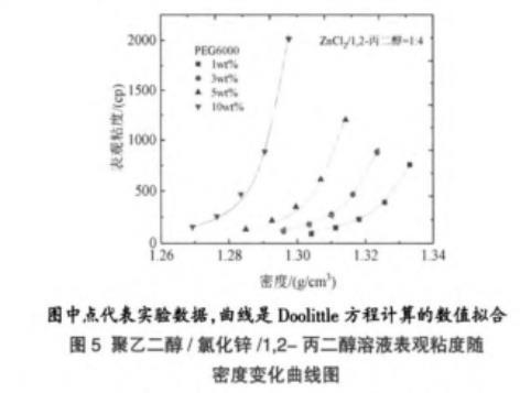 图5聚乙二醇/氯化锌/1,2-丙二醇溶液表观粘度随密度变化曲线图