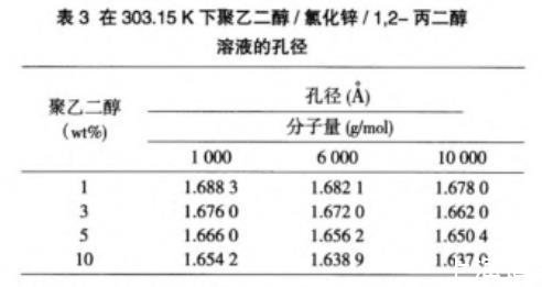 表3在303.15 K下聚乙二醇/氯化锌/1,2-丙二醇溶液的孔径