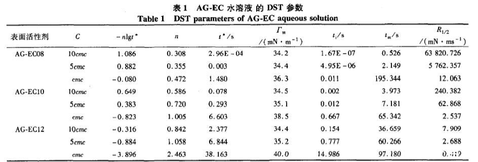 表面活性剂的DST曲线受到扩散能与吸附能的控制,由图4可知,对于AG.EC08、AG—EC10和AG.EC12,随着表面活性剂浓度的增大,介平衡表面张力会降低,DST曲线也越低。由表1可知,n、ti和t值随着表面活性剂浓度的增大而越小,说明扩散速率变快,体系诱导区结束的时间和达到介平衡状态的时间变短。随着溶液中AG—EC浓度增加,让更多AG.EC分子扩散到溶液面下层,所以扩散速率会更快。另外参数R更大,也说明表面张力以更快的速率下降,即AG.EC动态表面活性是随着其浓度的升高而增加。特性时间t值变小,是由于在吸附的后期,溶液表面已排列了大量的表面活性剂分子,此时表面已经比较拥挤,使吸附能垒增大,于是表面活性剂分子更不容易吸附在溶液表面;在吸附层的大量AG-EC分子保持了一种介于吸附与脱附两种状态之间的动态平衡,如果界面上的AG-EC分子较多,则脱附较快,难以吸附新的表面活性剂分子。另一方面,AG—EC分子结构比较复杂,溶解后为带两个电子的阴离子表面活性剂,当AG—EC分子从溶液本体向其表面扩散时,会被表面已经吸附的AG—EC分子排斥,难以被吸附。