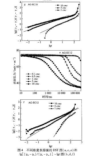 在25cc下测定不同浓度AG.EC水溶液的DST,并利用Rosen模型处理,得到其动态表面张力参数,见图4、表1。