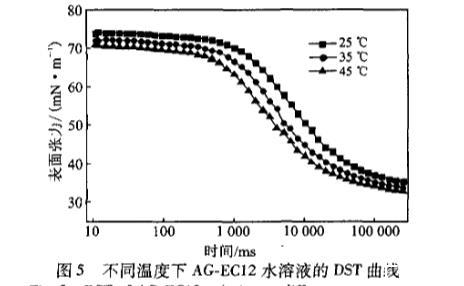 由图5可知,当温度升高,DST下降的速率明显加快。这是因为分子的不规则运动更加激烈,使得分子间的引力减小。表面张力越早开始下降,在各个阶段的表面张力值就越低。在45℃下开始测量时,表面张力已经降到了70mN/m左右,这也许是由于温度升高降低了纯溶剂水的表面张力。升高温度,表面张力下降的更快,更易达到第四个阶段平衡状态。这说明了高温下其动态表面活性更好。可能是由于表面活化能在高温时更低,使得AG.EC分子更易在溶液表面吸附。
