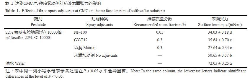当溶液中的表面活性物质的质量浓度达到其CMC时,液体具有良好的吸附和润湿性,因此确定助剂的最低施用浓度以大于等于其CMC为依据。3种喷雾助剂的CMC测定结果见图1。NF-100、GY-T12和迈润3种喷雾助剂的CMC的对数值分别为2.40、3.43和3.46,得到其CMC分别为250、2708和2877 mg/L,其中糖基类表面活性剂NF-100具有更低的CMC,比另外两种低一个数量级。根据助剂添加量应适当大于其CMC的原则,考虑量取方便,将NF-100的添加量确定为500 mg/L、折算为质量分数0.05%,将GY-T12和迈润的添加量确定为3000 mg/L、折算为质量分数0.3%。在此添加量下,测定了3种喷雾助剂对氟啶虫胺腈药液表面张力的影响。结果(表1)表明,添加NF-100、GY-T12和迈润3种助剂后,氟啶虫胺腈药液的表面张力显著降低,由未添加助剂时的50.65 mN/m分别降低至34.03、35.64和27.64 mN/m,其中迈润对药液表面张力的降低效果最显著,3种助剂之间均存在显著差异(P<0.05)。
