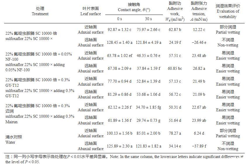 表2氟啶虫胺腈添加助剂在苹果叶片表面接触角、黏附功及黏附张力的变化