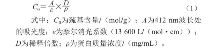 式中:C0为巯基含量/(mol/g);A为412 nm波长处的吸光度;ε为摩尔消光系数(13 600 L/(molgcm));D为稀释倍数;ρ为蛋白质量浓度/(mg/mL)。