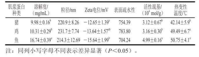 溶解度是反映蛋白质溶液状态和聚集程度的重要参数,肌肉蛋白质的溶解度是指在特定的提取条件下溶解于水溶液中的原蛋白质百分比,它是溶质(蛋白质)和溶剂(水)之间平衡的表现,如表2所示,对于相同条件提取的蛋白,鱼肉肌浆蛋白溶解度显著最大达到(16.74f0.39)mg/mL(P<0.05),而猪肉肌浆蛋白与鸡肉肌浆蛋白均在9.5~10.6 mg/mL之间,后面的二者间溶解度无显著差异(P>0.05)。从粒径的角度看,大粒径极大可能在空间产生位阻,进而削弱表面疏水性的提高带来的扩散速率增加。鸡肉肌浆蛋白的粒径为(231.7f7.74)nm,相对稍大于其他两种肌浆蛋白,但是整体无显著差异(P>0.05),这一现象与吸附动力学具有理论关联性。蛋白质电位是衡量体系稳定性的重要指标,因为它不仅反映颗粒所带电荷的大小,而且还能表征颗粒间相互作用的强弱,Zeta电位越高,即所带电荷数越多,体系就越稳定。