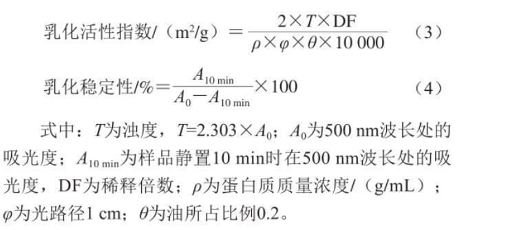 式中:T为浊度,T=2.303hA0;A0为500 nm波长处的吸光度;A10min为样品静置10 min时在500 nm波长处的吸光度,DF为稀释倍数;ρ为蛋白质质量浓度/(g/mL);φ为光路径1 cm;θ为油所占比例0.2。