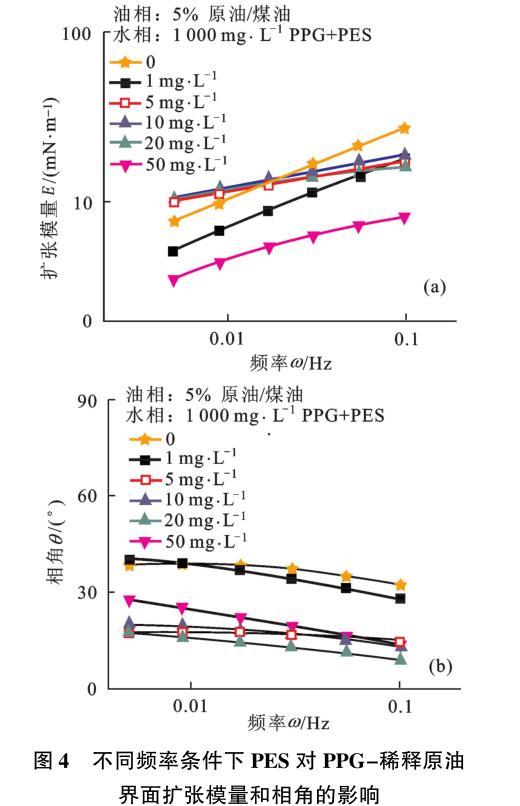 图4不同频率条件下PES对PPG-稀释原油界面扩张模量和相角的影响
