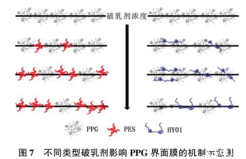 图7不同类型破乳剂影响PPG界面膜的机制示意图