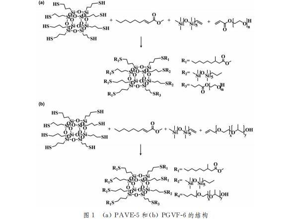 在已经加入25mL二氯甲烷溶剂的50mL圆底烧瓶中加入定量组分的APEG400、VDMS和FEMA,进行混合溶解,最后加入1%(质量分数)的光引发剂溶解完全后进行封口处理,于温度为30℃、搅拌速度为300r/min的条件下,放置于紫外灯(20W)照射45min,反应结束后,旋蒸除去溶剂,最终得到无色透明、流动性明显且富有粘稠状态的液体产物POSS-APEG4001-VDMS2-FEMA5,简称为PAVE-5。同样的方法改变其中之一的单体为APEG750,合成得到POSS-APEG7501-VDMS1-FEMA,简称PGVF-6。