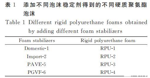 根据传统制备工艺制备硬质聚氨酯泡沫,分别把添加国产-1、进口-2、PAVE-5和PGVF-6泡沫稳定剂得到的硬质聚氨酯泡沫命名为RPU-1、RPU-2、RPU-3、RPU-4。