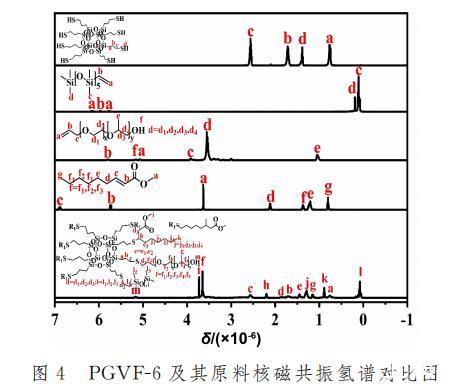 图4为PGVF-6以及其原料的核磁共振对比图。PGVF-6谱图中,SH-POSS上的-SH质子氢吸收峰已经消失,接枝成功的APEG750单体,烯烃双键的质子氢吸收峰已经消失,末端连接的-OH质子氢吸收峰在5.21times 10^{-6}处;同样反应成功的2-壬烯酸甲酯单体,烯烃双键的质子氢吸收峰也同样消失不见,连接O的末端烷烃-CH3质子氢吸收峰处于3.72x10-6的位置,末端烷烃-CH3的质子氢吸收峰在0.88x10-6处;最后成功反应的VDMS单体,烯烃双键的质子氢吸收峰也已经消失,后续Si上连接的所有甲基-CH3分别处在0.12x10-6和0.08x10-6处,可以得知PGVF-6杂化材料成功合成。