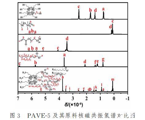 采用核磁共振氢谱对所制备复合材料的化学结构进一步表征分析。图3为PAVE-5以及其原料的核磁共振对比图。PAVE-5谱图中,SH-POSS的-SH质子氢吸收峰已经消失,接枝成功的APEG400烯烃双键的质子氢吸收峰已经明显消失,末端连接的-OH质子氢吸收峰在5.32x10-6处;同样反应成功的2-壬烯酸甲酯单体,烯烃双键的质子氢吸收峰也同样消失不见,连接O的末端烷烃-CH3质子氢吸收峰处于3.75x 10-6的位置;最后成功反应的VDMS单体,烯烃双键的质子氢吸收峰也已经消失,Si上连接的所有甲基CH3分别处在0.09x10-6和0.14x10-6处,可以得知PAVE-5成功合成。