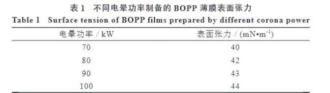 本研究使用的双向拉伸聚丙烯薄膜原膜由公司的法国CELLER生产线制备,平均厚度30μm,熔点165℃。在一定预热温度下,原膜经过电晕处理器以70~100 kW的功率处理后即可制得成品BOPP薄膜。