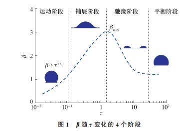 根据β随τ变化情况,液滴碰撞分为运动、铺展、弛豫和平衡4个阶段,如图1所示。在运动阶段(τ<0.1),惯性力占主导地位,液滴上部仍保持球状,下部铺展成楔形边缘,文指出该阶段可忽略流体性质影响,β随τ呈指数上升,即β∝τb,其中指数b介于0.45到0.57之间,一般取b=0.5;在铺展阶段,受黏性力或毛细力的主导作用,β逐渐增至βmax,然后液滴开始回撤收缩,进入驰豫阶段;在平衡阶段,液滴可能稳定铺展,也可能发生反弹,或者碎裂飞溅。本文主要针对运动阶段和铺展阶段进行研究。