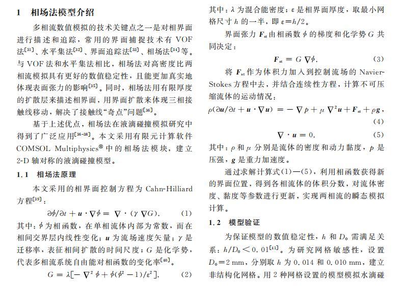基于上述优点,相场法在液滴碰撞模拟研究中得到了广泛应用。本文采用有限元计算软件COMSOL Multiphysics