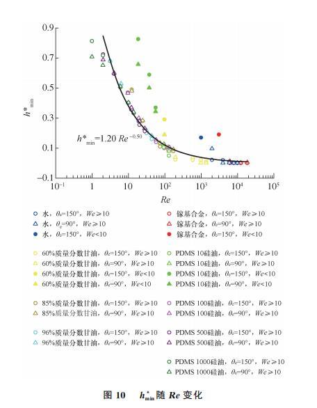 此外,当Re接近于1时,hmin明显偏离hmin∝Re-0.5规律,其原因与上文所述一致,即高黏度液滴低速碰撞壁面时,液滴更多的表现出自然铺展特性。