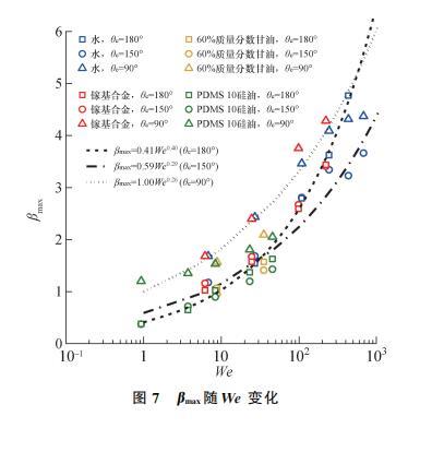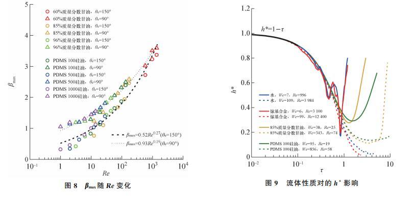 如表1所示,文指出在黏性力主导区(P>1)存在规律βmax∝Re0.2.本文在黏性力区的研究采用3种质量分数的甘油溶液、3种型号的PDMS甘油,黏度变化范围为10——970 mPa·s,跨越近3个数量级。其中,黏度极高的PDMS1000硅油在低速碰撞壁面时有Re=1.