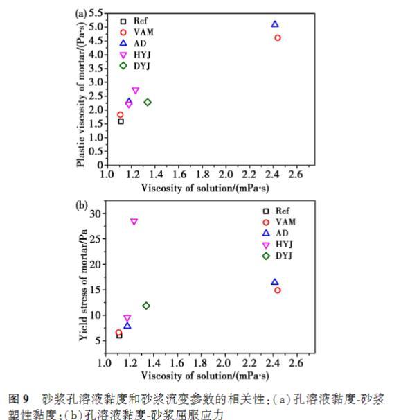 采用改进的Bingham模型对砂浆的流变曲线进行拟合,获取屈服应力和塑性黏度。当溶液黏度为1.5mPa·s时,砂浆的初始屈服应力和塑性黏度相对于基准砂浆略微增大,60min后的流变参数出现不同发展趋势;当溶液黏度为6mPa·s时,砂浆的屈服应力均高于基准砂浆;VAM和AD砂浆的初始屈服应力高于基准砂浆147%和172%,塑性黏度高出基准砂浆的191%和220%;HYJ和DYJ砂浆的初始屈服应力高于基准砂浆619%和254%,初始塑性黏度高出基准砂浆的64%和82%.