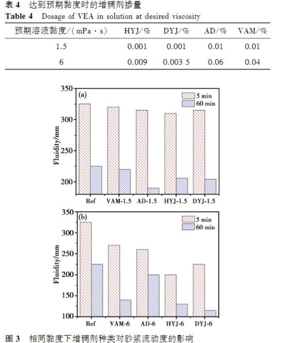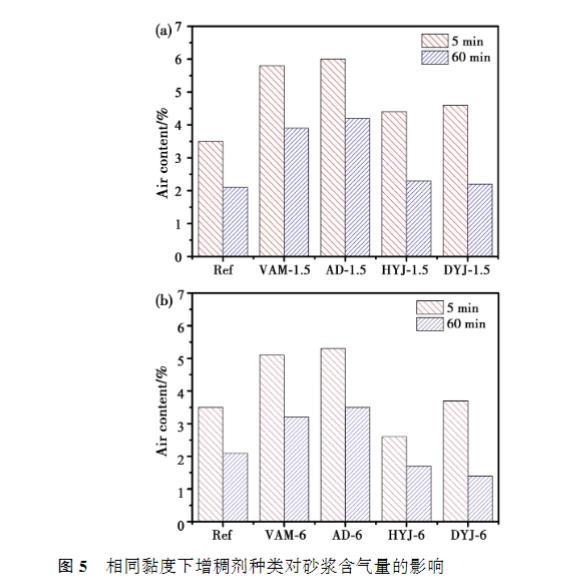 增稠剂溶液的黏度越高,砂浆的流动度越低。在较低黏度下,四种增稠剂对砂浆初始流动度的影响接近,60min时,AD的经时流动度最低,VAM流动度相对于基准砂浆略微下降;然而当溶液黏度提高至6mPa·s时,掺入HYJ和DYJ的砂浆流动度显著低于AD和VAM,60min后的损失也更大,AD的经时流动度略低于基准砂浆。