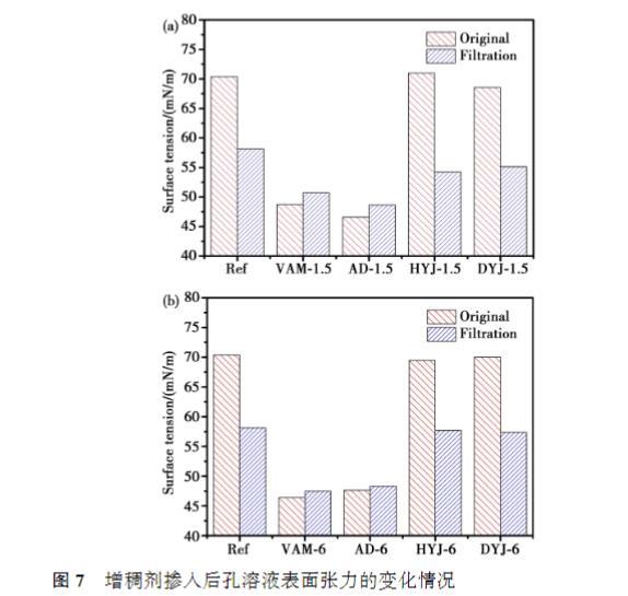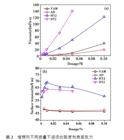 相同掺量下,DYJ的黏度最高,其次是HYJ,VAM和AD黏度在低掺量下接近,掺量达到0.10%之后,VAM黏度高于AD;VAM和AD的黏度随着掺量的提高缓慢增大,而HYJ和DYJ溶液的黏度随掺量的提高迅速提高,尤其是DYJ的增长幅度更为显著。总体来看,增稠剂分子量越大,相同掺量时溶液的黏度越高。从表面张力的结果来看,相同掺量下,HYJ溶液的表面张力最高,其次是DYJ,VAM和AD的表面张力显著低于其他两种增稠剂,且AD略微高于VAM.