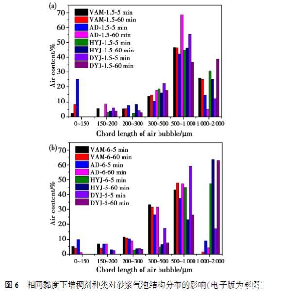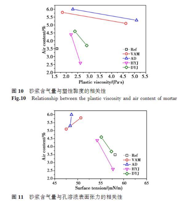 当溶液黏度为1.5mPa·s时,VAM和AD的掺入使砂浆初始含气量相对于基准砂浆增大66%和71%,而HYJ和DYJ仅使初始含气量提高26%和31%;当溶液黏度为6mPa·s时,VAM和AD的掺入使砂浆初始含气量相对于基准砂浆增大46%和51%,而DYJ仅使初始含气量提高6%,HYJ则降低含气量26%.