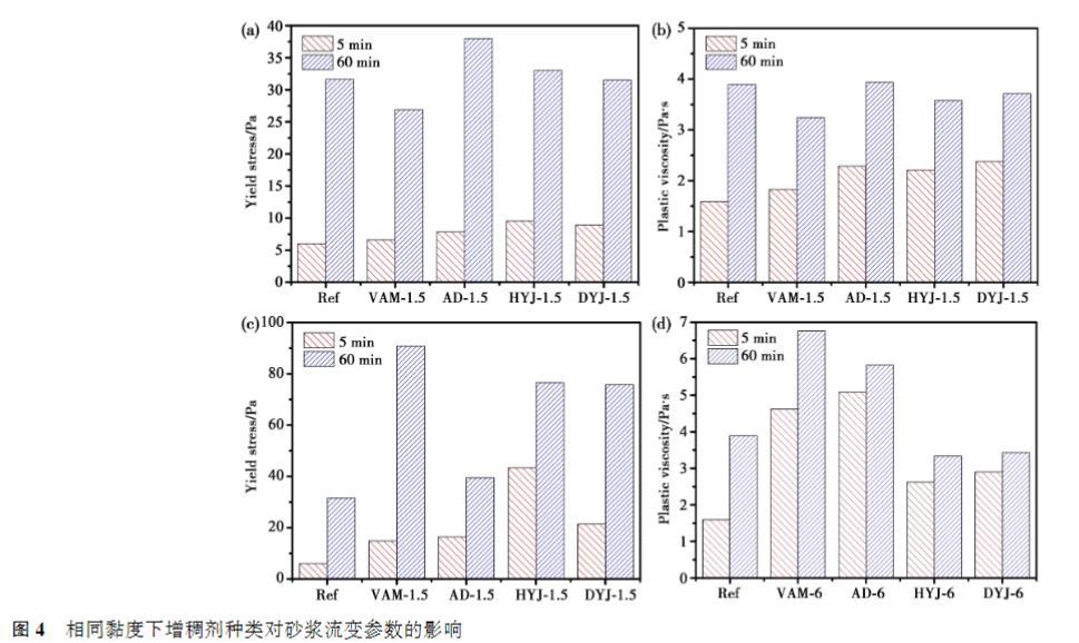 (1)增稠剂的加入显著降低砂浆的流动度,提高砂浆的屈服应力和塑性黏度。