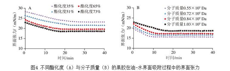 图4不同酯化度(A)与分子质量(B)的果胶在油-水界面吸附过程中的界面张力