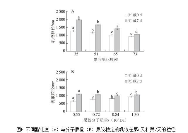 图5不同酯化度(A)与分子质量(B)果胶稳定的乳液在第0天和第7天的粒径