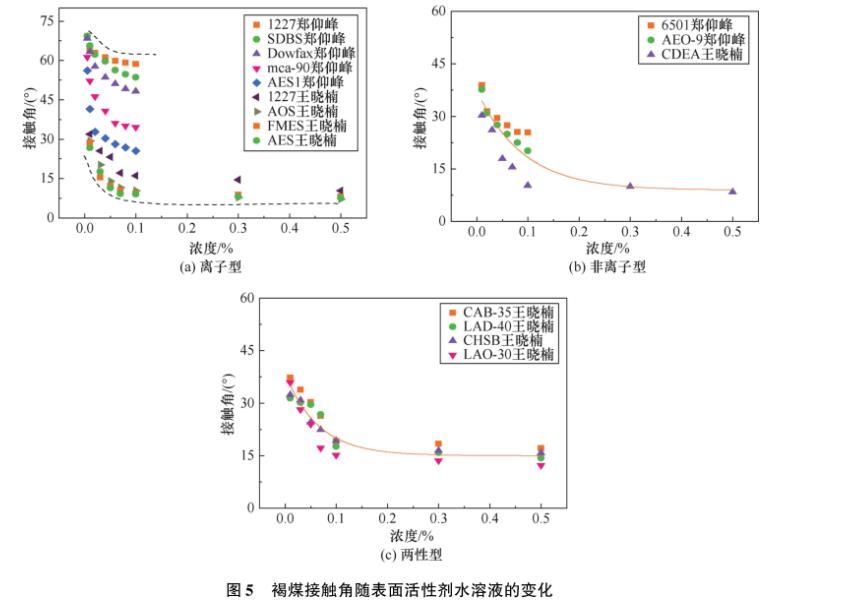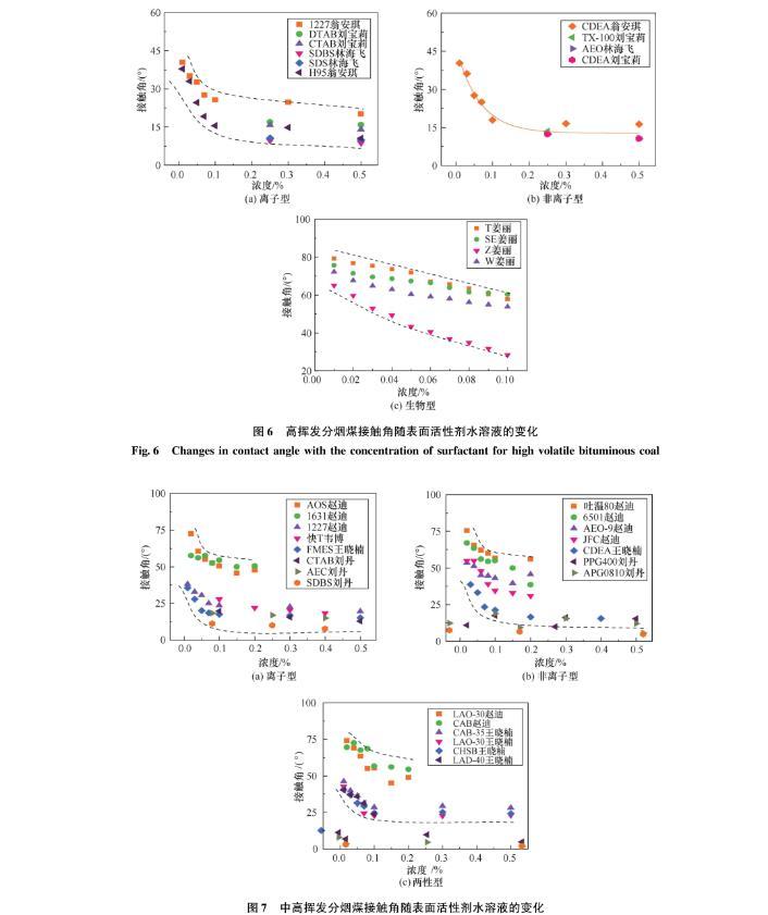 图6高挥发分烟煤接触角随表面活性剂水溶液的变化
