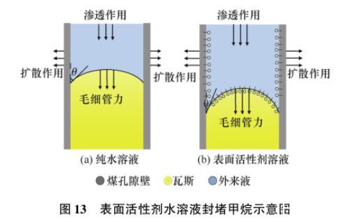 毛细管力与溶液表面张力成正比、与孔隙半径成反比;同时,接触角越小,毛细管力越大。由表5可知,朱锴[21]试验并计算煤样10 nm孔径的毛细力,发现自配的表面活性剂水溶液能够使毛细力平均提高2倍,最大提高4.03倍。如图13所示,在扩散、渗透和毛细力共同作用下,表面活性剂水溶液沿着煤体表面、孔隙和裂隙进入煤体内部产生液相滞留效应,增大煤润湿效果的同时其内部瓦斯流动阻力变大,孔隙内瓦斯气体被水溶液封堵。因此,添加活性剂水溶液能够减小水溶液的表面张力、降低水溶液与煤之间的接触角,增强煤的润湿效果,达到抑制煤层瓦斯的解吸、延缓采动煤岩体中瓦斯逸散的目的,从而降低开采工作面瞬时瓦斯涌出量。也有学者[21,29,32]分析认为,添加表面活性剂水溶液会降低煤体温度、增强煤吸附瓦斯的能力,使得部分游离态瓦斯转变为吸附态,相应地减少了瓦斯气体的逸散涌出。