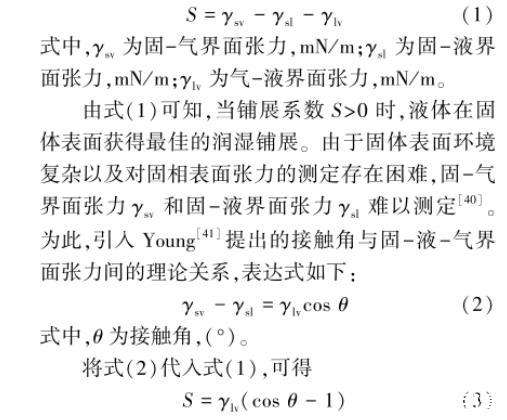 由式(1)可知,当铺展系数S>0时,液体在固体表面获得最佳的润湿铺展。由于固体表面环境复杂以及对固相表面张力的测定存在困难,固-气界面张力γsv和固-液界面张力γsl难以测定[40]。为此,引入Young[41]提出的接触角与固-液-气界面张力间的理论关系,表达式如下: