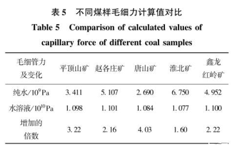 表5不同煤样毛细力计算值对比