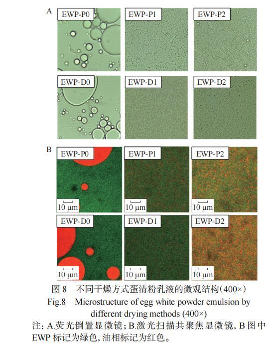 EWP-P和EWP-D经高压均质机均质0、1、2次后所得乳液的微观结构如图8所示。未高压均质的蛋清蛋白乳液油滴大,且不均一,蛋白质容易从油水界面解离出来,使小油滴聚集形成大油滴。均质1次后蛋清蛋白乳液的油滴尺寸减小,分散性提高,且未发生团聚现象,其原因可能是高压均质后,蛋清蛋白乳液被高压剪切力切割形成小分子,使蛋清蛋白粒径减小,更多的蛋白质吸附至油-水界面,为液滴间提供足够的排斥力,从而阻止乳析的发生,使蛋清蛋白乳液的稳定性增强。均质2次后,两者均出现了小程度的团聚现象,形成了较大的油滴,这可能是因为均质次数增多,体系出现了“过处理”效应,高压使蛋清蛋白乳液的油滴变小,油滴之间的运动速率加快,增加了相互碰撞的次数,从而破坏界面膜,导致油滴聚集。刘竞男等研究高压对大豆分离蛋白的影响时也发现随着均质次数的增多,大豆分离蛋白的乳液体系出现了“过处理”效应,这被归因为部分解离的大豆蛋白分子重新通过新的二硫键形成了聚集体。EWP-P的团聚现象比EWP-D的更明显,可能是因为EWP-P的溶解度较低且表面巯基含量较高,故更易于聚集。以上结果表明,EWP-D乳液的稳定性高于EWP-P,说明真空冷冻干燥更有利于蛋清蛋白的乳液稳定。