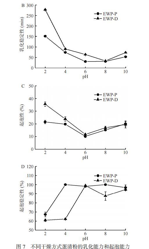 泡沫的形成依赖于由蛋白质形成的界面膜及其在悬浮液中保持气泡和减缓聚结速率的能力,其中蛋白质的发泡能力和稳定性与蛋白与水相在界面上的相互作用有关,受蛋白分子柔性、净电荷、构象和疏水性的影响。蛋清蛋白在pH2.0~10.0条件下的起泡性如图7C所示,EWP-D的起泡性优于EWP-P,这可能是由于EWP-D的溶解度较高,在起泡过程中蛋白能迅速展开,形成能同时连接水相溶剂与空气界面的两性介质,而自身的带电性又可产生一定的静电排斥,使蛋白分子在空气-水界面上呈现规律性排列,而不会发生聚集。相比之下,EWP-P在高温发生的美拉德反应会使蛋白形成更大的空间位阻,进而延缓了蛋白质在空气/液体界面的吸附。pH为6.0时,EWP-P和EWP-D的起泡性较低,分别是10.19%±1.01%和11.7%±0.66%,这是由于该pH下蛋白的溶解度和表面张力较低,蛋白易发生聚集,故不易形成泡沫。