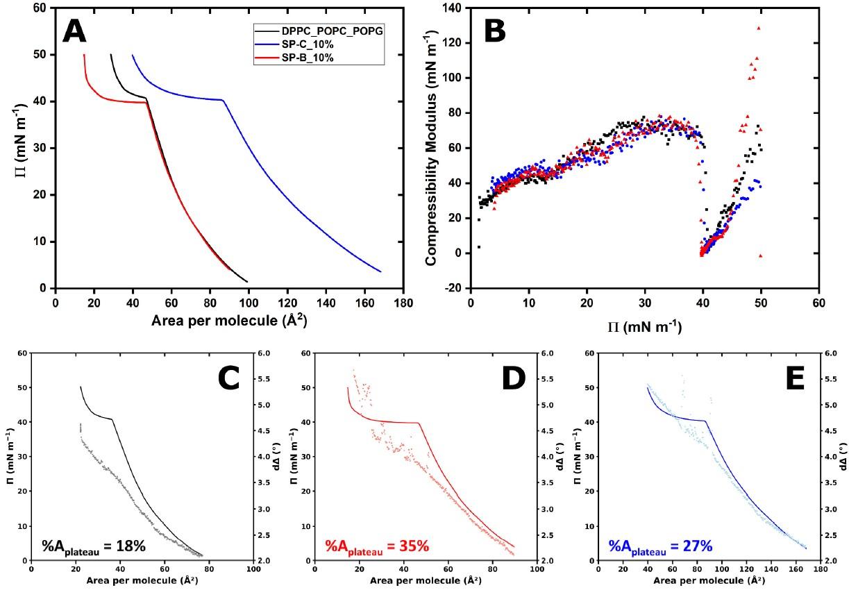 XDEVIOS官方免费版安装可获取表面压力-面积(Π-A)等温线,直接用于测量模型单层膜(纯脂质、脂质+SP-B、脂质+SP-C)的压缩Π-A等温线。等温线显示,所有系统在压缩至约40 mN/m时均出现一个明显的平台区,这对应于单层膜从二维向三维结构的转变(buckling-dominated collapse),模拟了生理呼气末期的膜重组过程。通过计算平台区压缩面积占总面积的百分比(%Aplateau),研究人员量化了SP-B和SP-C在稳定三维结构能力上的差异。结果表明SP-B系统的%Aplateau(35%)显著高于SP-C系统(27%)和纯脂质系统(18%),直接证明了SP-B在促进和稳定膜储备库形成方面具有更强大的能力。与椭圆偏振测量联用,研究中,将Beaglehole Picometer Light Ellipsometer与Kibron G2槽联用,实时监测压缩过程中光学参数d△的变化。